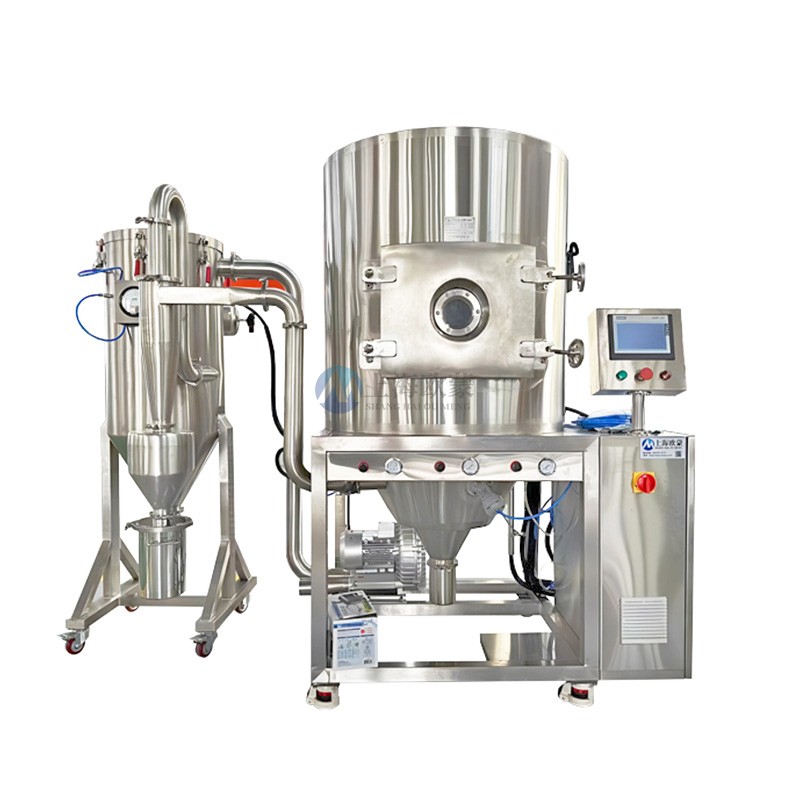 噴霧干燥機(jī)為開式循環(huán),并流式,離心式霧化。干燥介質(zhì)空氣經(jīng)過(guò)初、中效空氣過(guò)濾器過(guò)濾后根據(jù)操作指令由鼓風(fēng)機(jī)吸取再經(jīng)加熱器加熱通過(guò)高效過(guò)濾器的熱風(fēng)分配器進(jìn)入噴霧干燥主塔。液體物料根據(jù)操作指令經(jīng)過(guò)蠕動(dòng)泵,進(jìn)入高速旋轉(zhuǎn)的離心噴頭,在離心力作用下被分散成小霧滴。在噴霧干燥主塔內(nèi),小霧滴與熱風(fēng)在充分接觸,沿其特定路徑進(jìn)行熱交換后被干燥成為產(chǎn)品,然后通過(guò)旋風(fēng)分離器實(shí)現(xiàn)分離,固體物料被收集,氣體介質(zhì)再經(jīng)過(guò)過(guò)濾后被排出。整套噴霧系統(tǒng)易清潔、無(wú)死角,符合GMP要求。