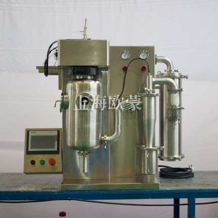 經過前道工序處理后的料液利用蠕動泵送至干燥室上方的霧化器,將料液均勻地霧化為極微米霧滴群,進入干燥室內,氣體進入加熱系統,被加熱至工藝所需的溫度,經熱風管道均勻進入干燥室,與霧滴群接觸后高溫固化,熱解成產品,干燥后的成品隨同尾氣經出風管送至旋風分離器進行氣固分離 ,成品回收,飽和尾氣經過除塵器濾芯過濾后進入OM-YJ-500型氮氣循環(huán)有機溶劑回收裝置的冷凝器進行溶劑回收,經過冷凝后的氮氣再次進入加熱器循環(huán)使用。